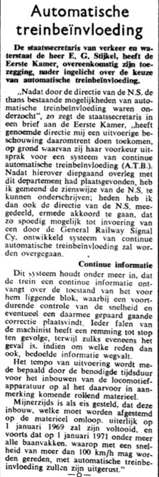 In 1963 werd het besluit genomen om de veiligheid van het spoorwegverkeer tot een hogere graad op te voeren. Dit besluit viel na een treinbotsing bij Harmelen in 1962 die bijna 100 mensenlevens eisten.Een aanvang werd gemaakt met het installeren van het z.g. Automatische Trein Beïnvloedingssysteem (ATB).Een systeem dat de reacties van de machinist bewaakt en deze zonodig corrigeert, door het tot stilstand brengen van de trein, ten einde te voorkomen, dat een om wat voor reden dan ook, falende machinist een treinbotsing veroorzaakt.